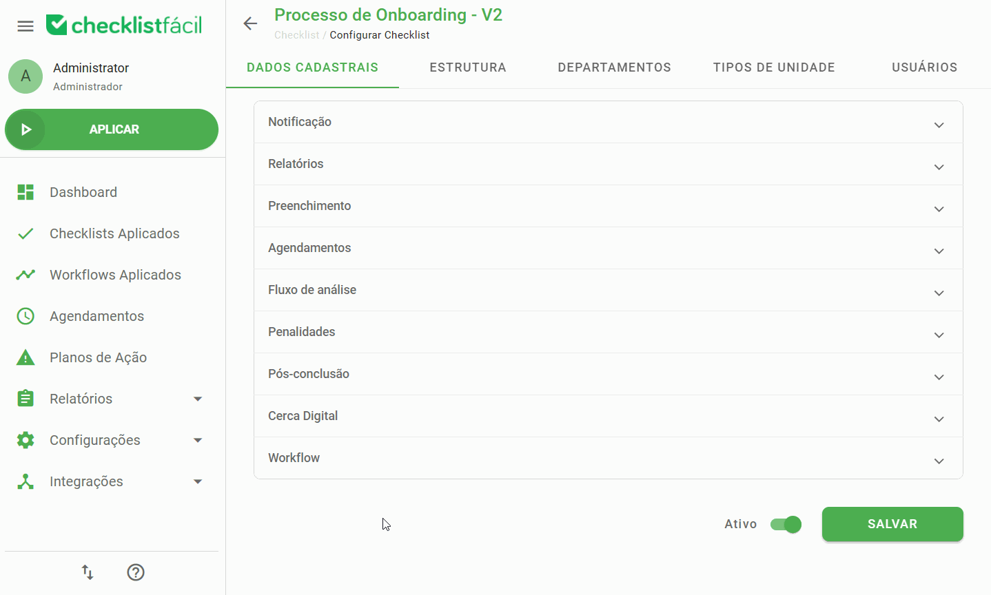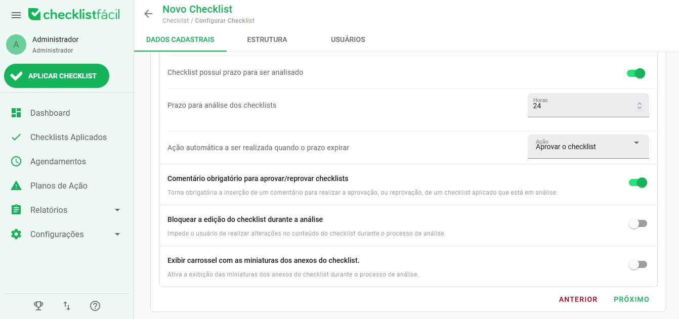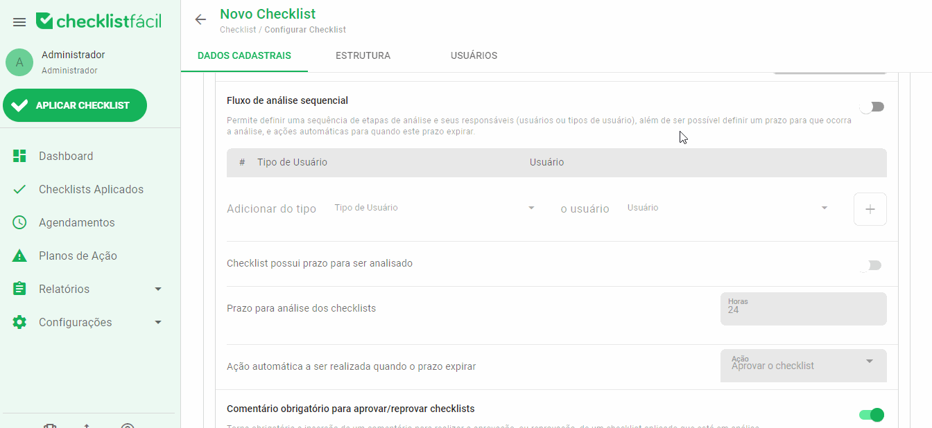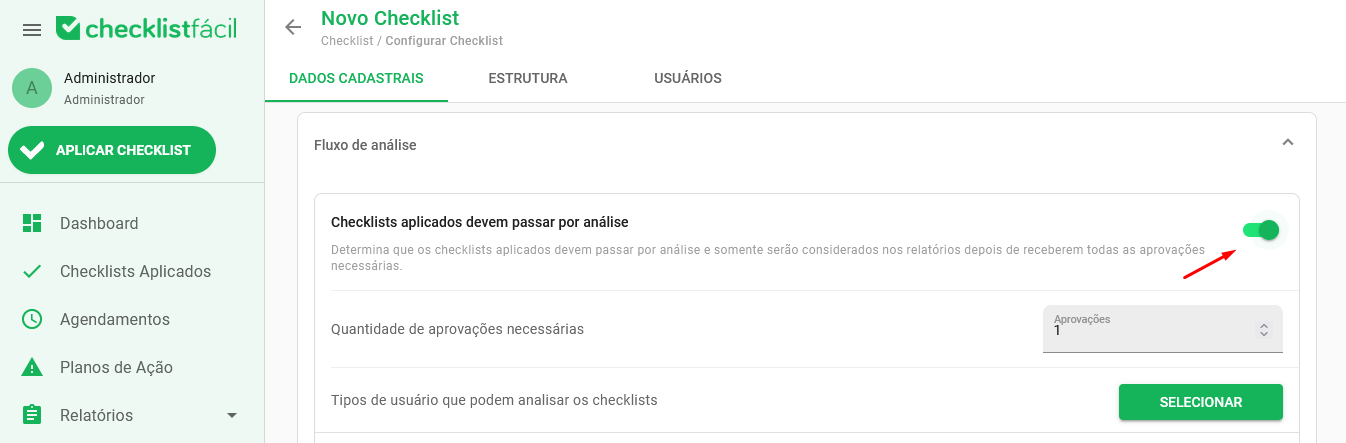 Accessing the configure checklists screen, in the registration data tab, we need to activate the Analysis flow: