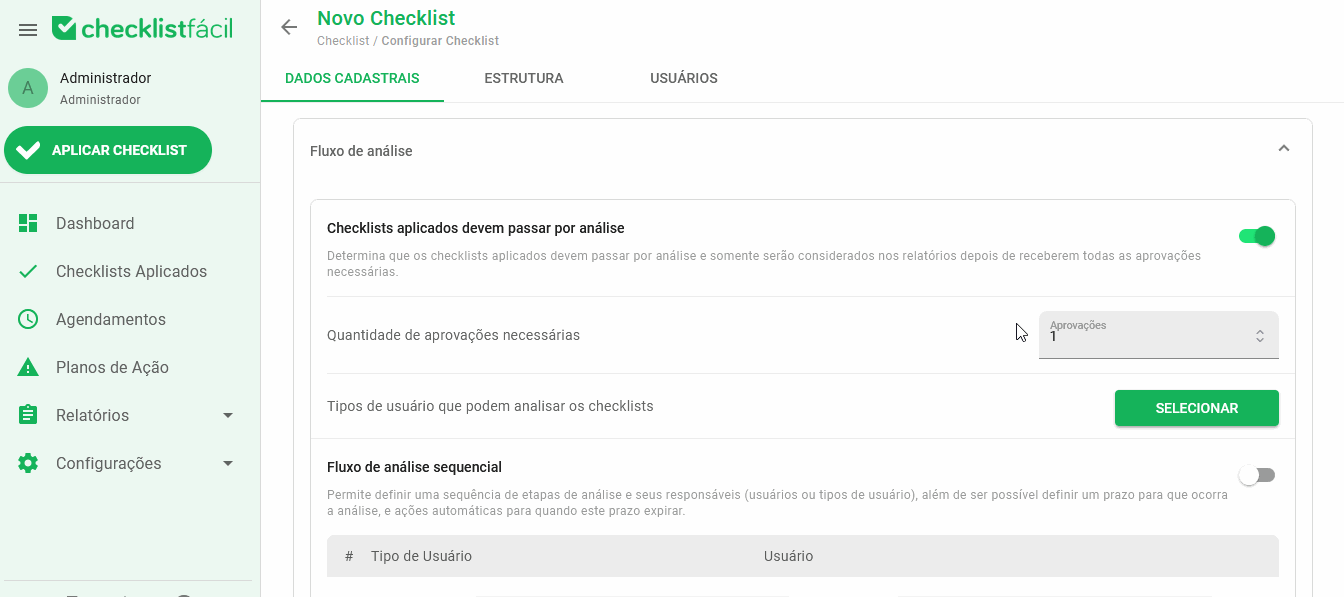 When you activate the flow, the system will allow you to choose the number of mandatory approvals and which types of users will be able to perform this analysis. Remembering that only types of users whose permission approves checklists are enabled will be available.