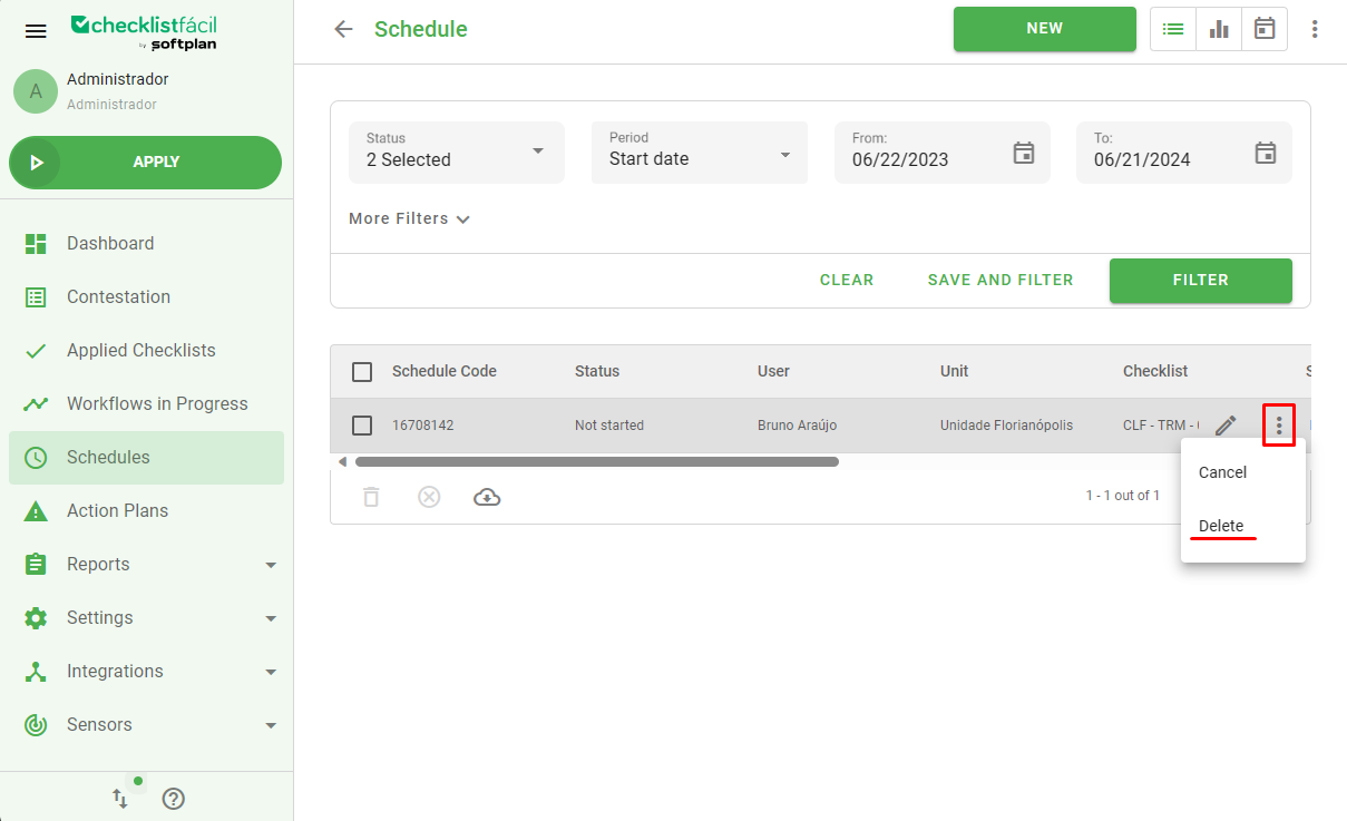 If you want to delete a schedule, just click on the icon with three dots on the right side of your schedule and select Delete. When the schedule is deleted, it is not possible to track the schedule history anymore.