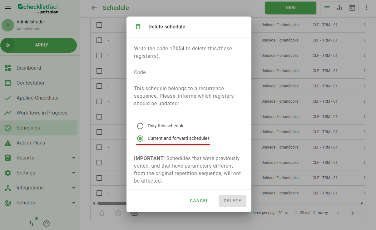 If your schedule has repetitions registered, you will see a screen opening when you click on the three dots icon. This screen is called Delete Schedule and it has the possibility of selecting the option Current and forward schedules.