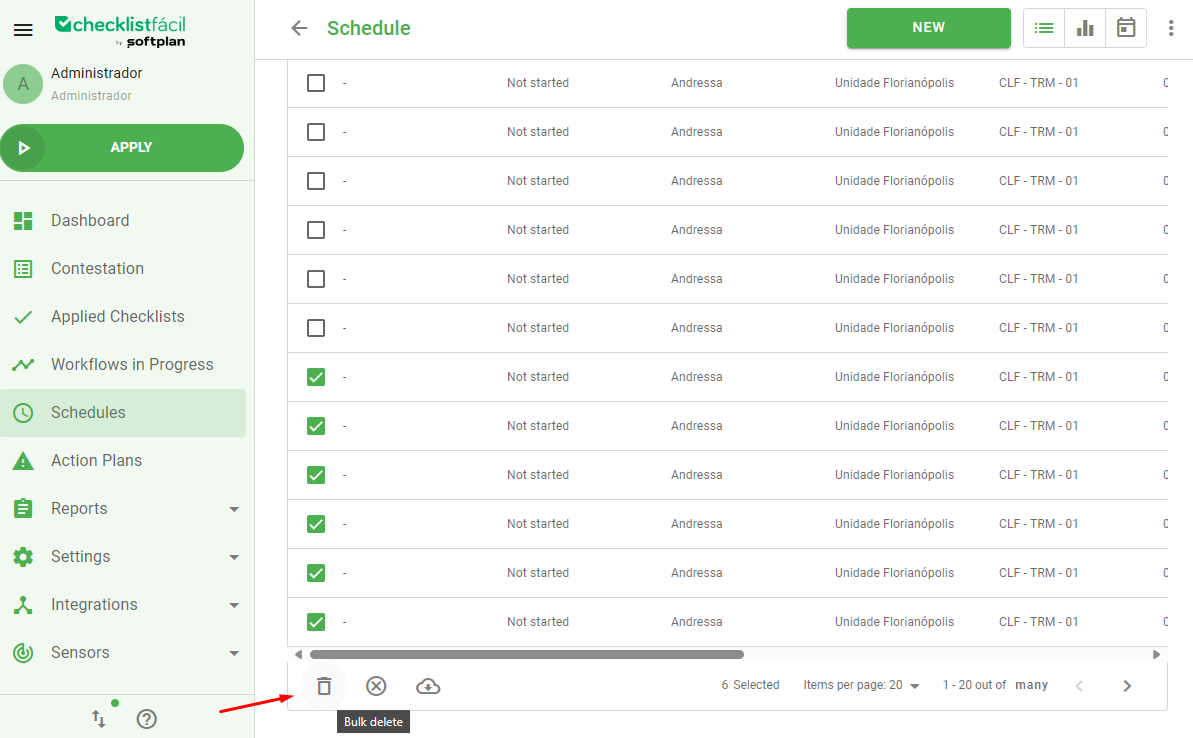 If you have a lot of schedules without repetitions, it is possible to delete many of them by selecting bulk delete, which is available at the end of the screen.