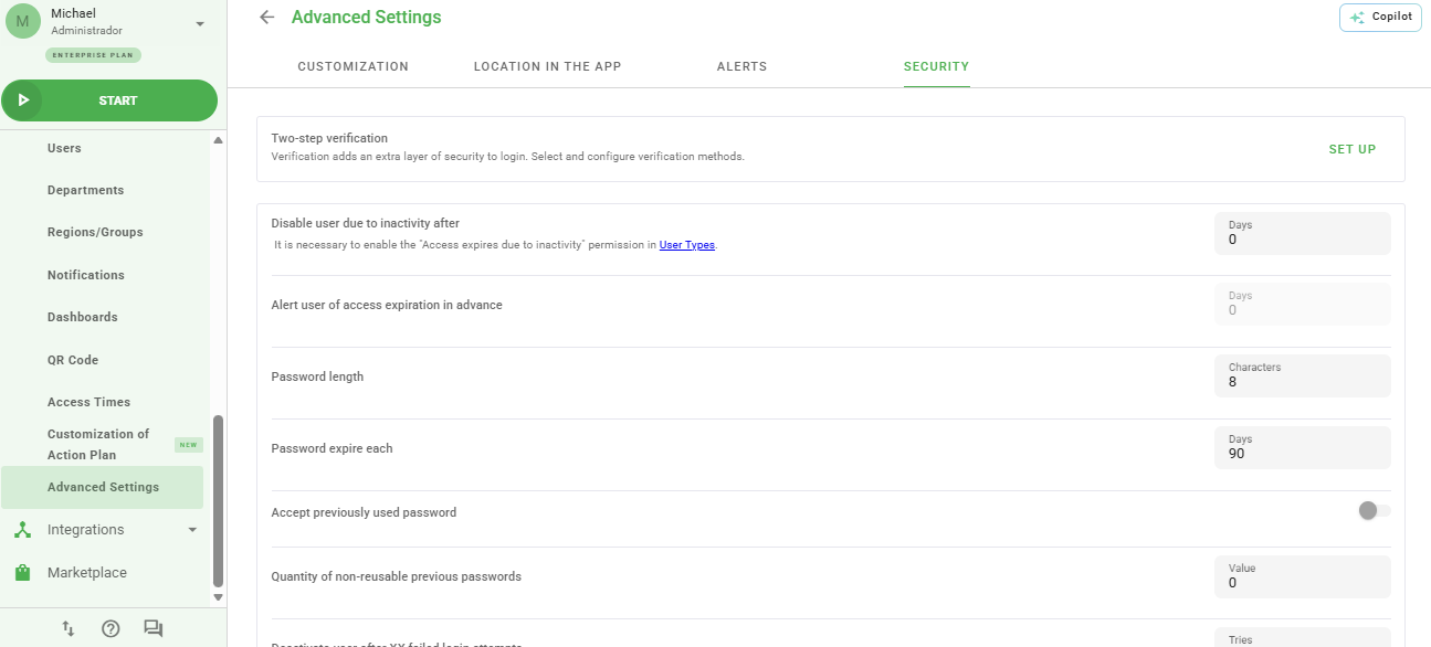 * Deactivate user when login fails after: How many attempts the user can make to log in. If the number of attempts is greater than configured, the user will be deactivated;