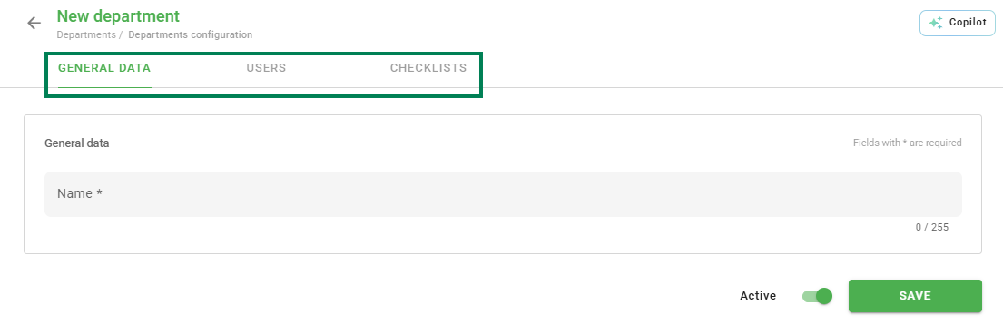 Registration data: defines the department name. Users: defines the users who will have access to this department. Checklists: defines which templates will be available for application.