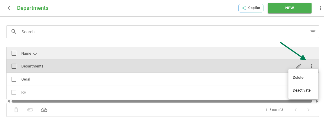 By accessing the Settings > Departments menu, you can view the general list, where you can edit, delete, or deactivate an existing department.