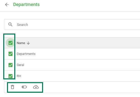 By selecting one or more departments in the list, you enable bulk actions. With this feature, it is possible to delete, deactivate, and export department records all at once.