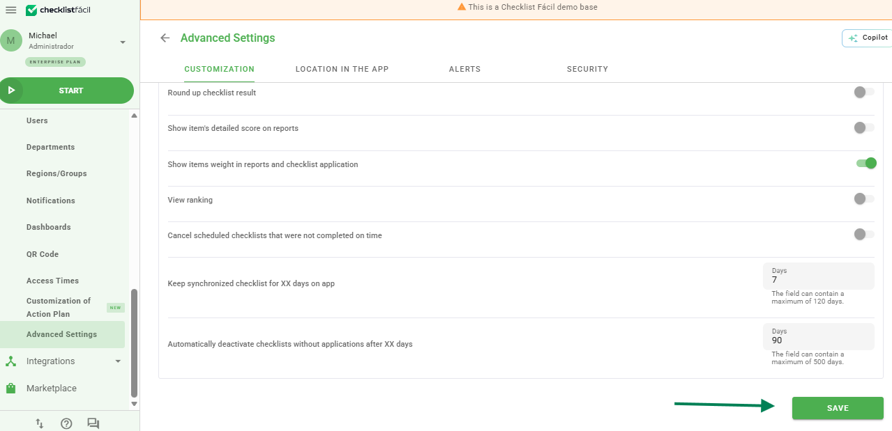 By following the path Settings > Advanced Settings and clicking on the customization tab, you have access to important tools to manage your account. In addition to adjusting the platform's look, it is possible to customize reports, define cleaning routines in the apps, and manage expired schedules.