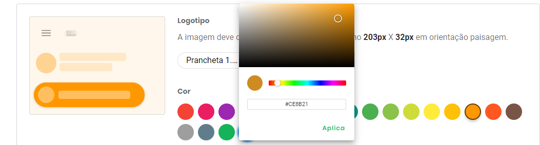 At the top of the tab, the logo option allows you to select an image and file to replace the current logo. The image must have a maximum size of 203px X 32px, in landscape orientation, to ensure greater display quality.