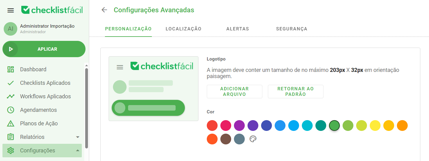 The aesthetic customization of the platform can be done by accessing Settings > Advanced Settings. In this screen you see the Personalization tab. It is possible to change the color and logo!