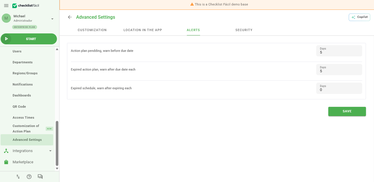 Pending action plan, notify before expiration: You can configure every how many days the address registered in the AP unit will be notified before expiration with a package of the action plans that are pending.