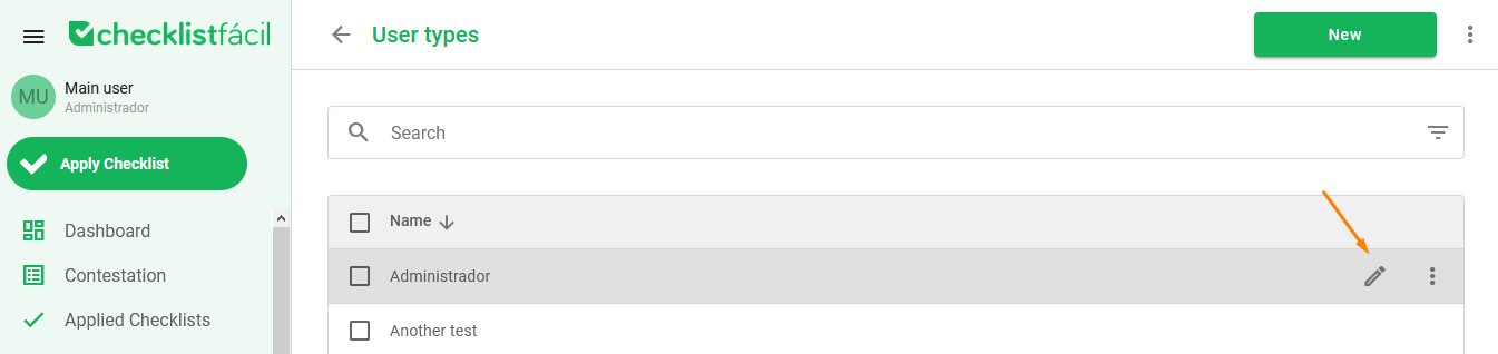 With a type of user already registered, it’s possible to define which are their access permissions. Accessing the user types screen it’s possible, in addition to editing, to perform mass actions such as delete, deactivating and exporting data.