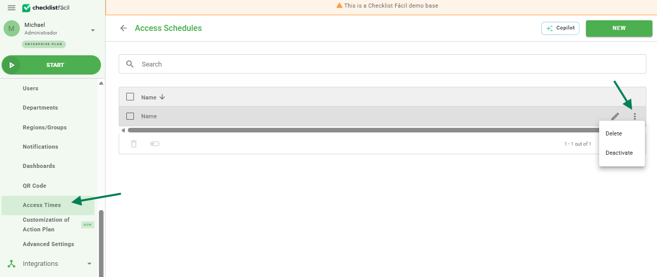 The main configuration screen allows for centralized management of all access periods defined for users.