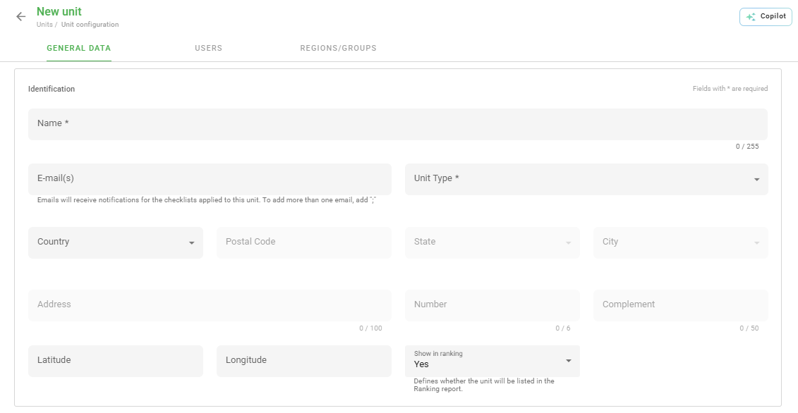 The first step is to fill in the Registration data. This information serves to identify the unit within the platform.