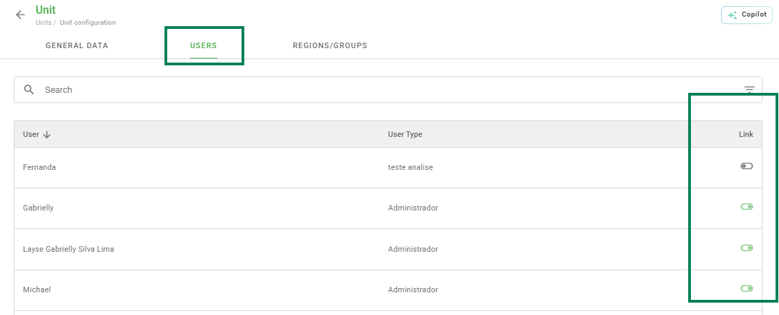 The Users tab allows you to define who will have access to this unit. You can link users individually or in bulk through the Link option.