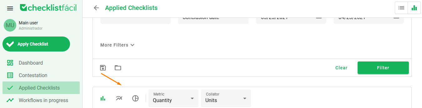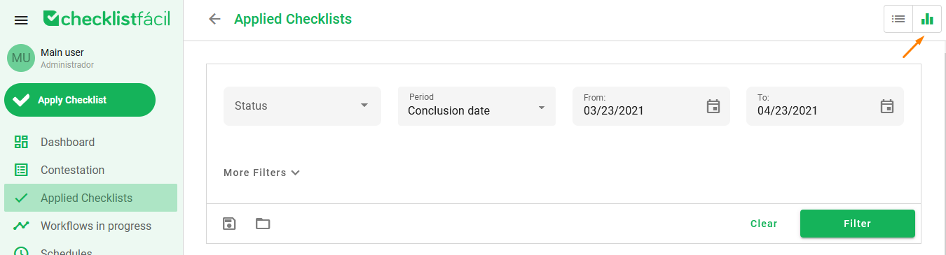 To have a Graph view of the evaluations, access the Applied Checklists screen, and select the graph view option.