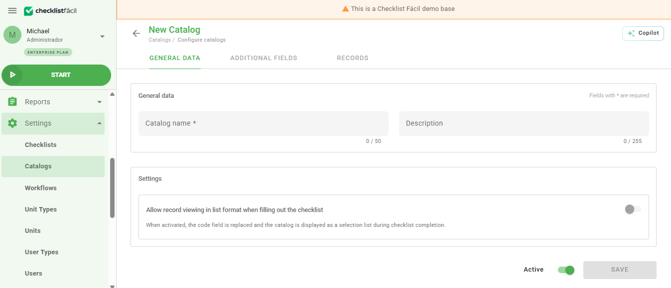 After filling in the information, save the form to start inserting the records. If you do not want to make this catalog available to the units yet, you can keep it inactive by unchecking the Active button.