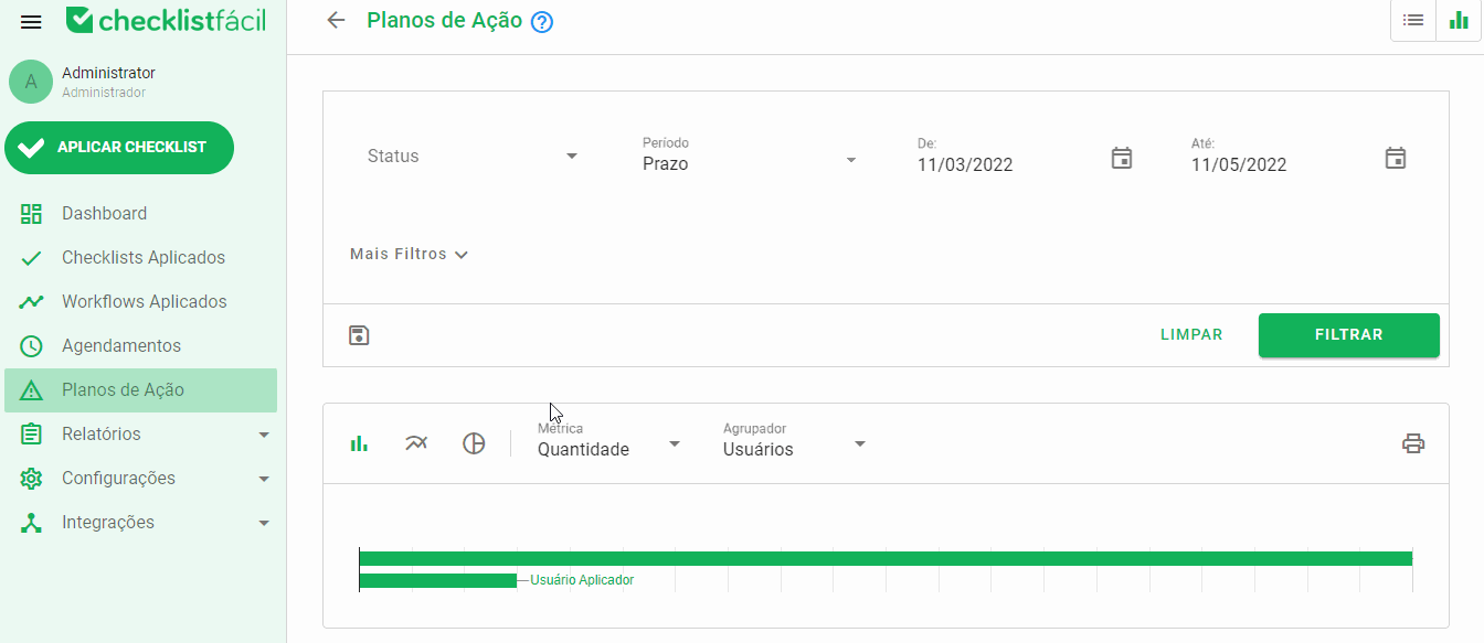 You can choose to display, for example, the quantity value, which is the number of action plans created. Right on the side, there is the Grouper, you can select which information will make up your chart, it is possible to change from one to the other during the analysis.