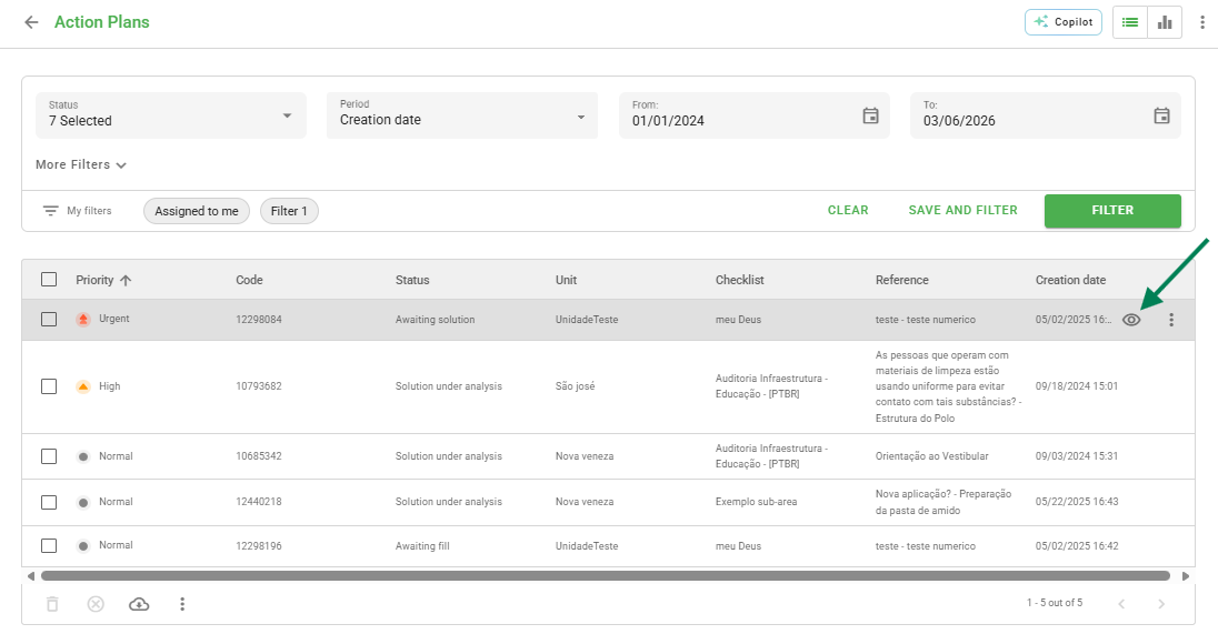 On the Action Plans page, when hovering over an item in the list view, you will find the view icon (represented by an eye) to access the plan details.