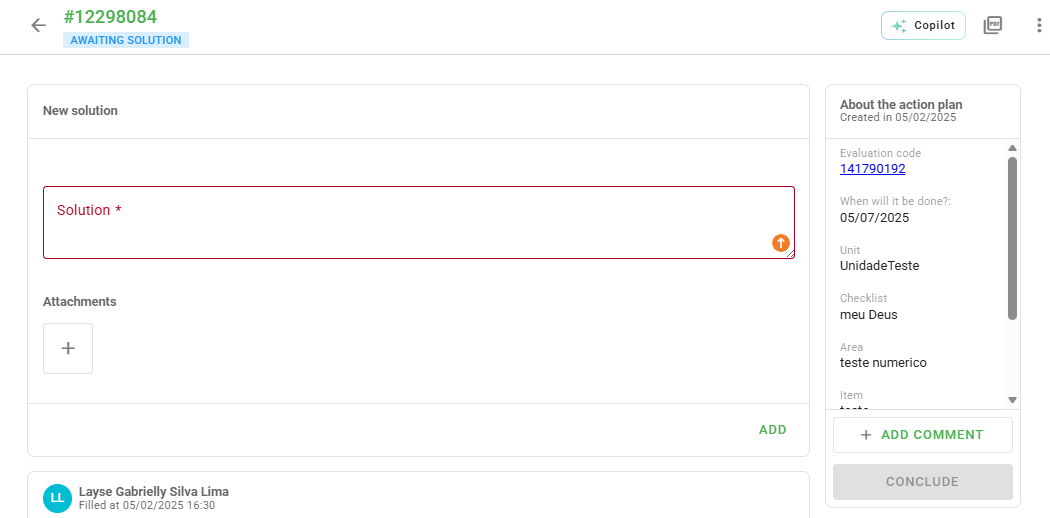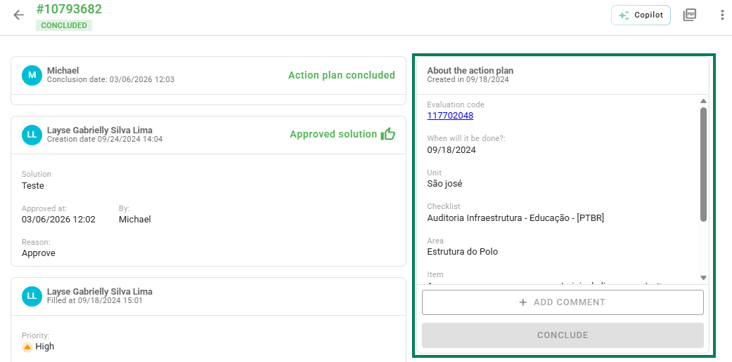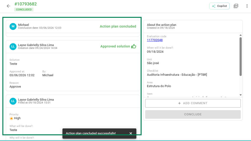 In the center of the screen, you can view the complete history of the Action Plan. This space centralizes all recorded actions and movements, allowing for detailed monitoring of task progress.