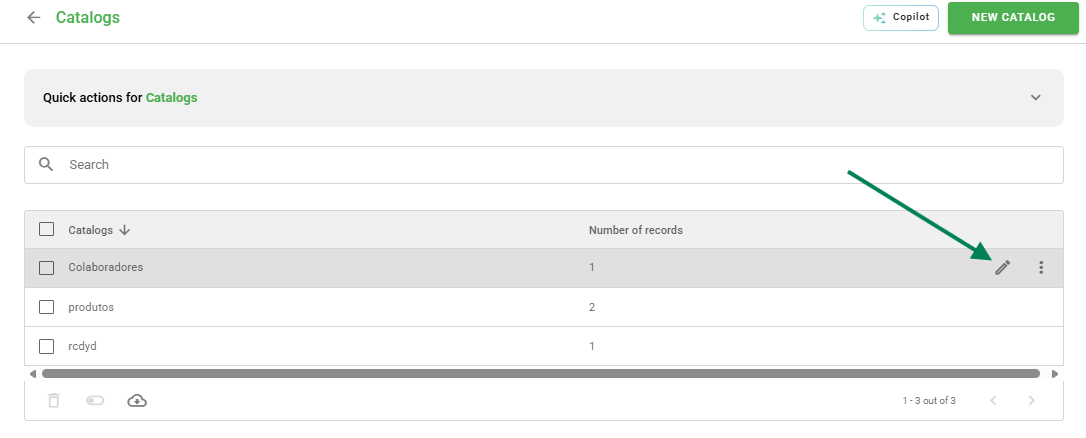 To start, access Settings > Catalogs. Hover your mouse over the desired catalog and click on the list icon.