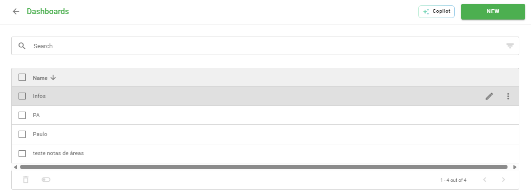 To edit a Dashboard, you need to access the administrative panel and follow the path Settings > Dashboards. When hovering the mouse over the desired Dashboard, the edit icon (pencil) will appear on the right side of the screen.