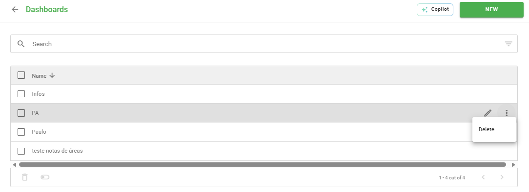 If you need to remove a Dashboard, click on the three dots located on the side of the item and select the Delete option.