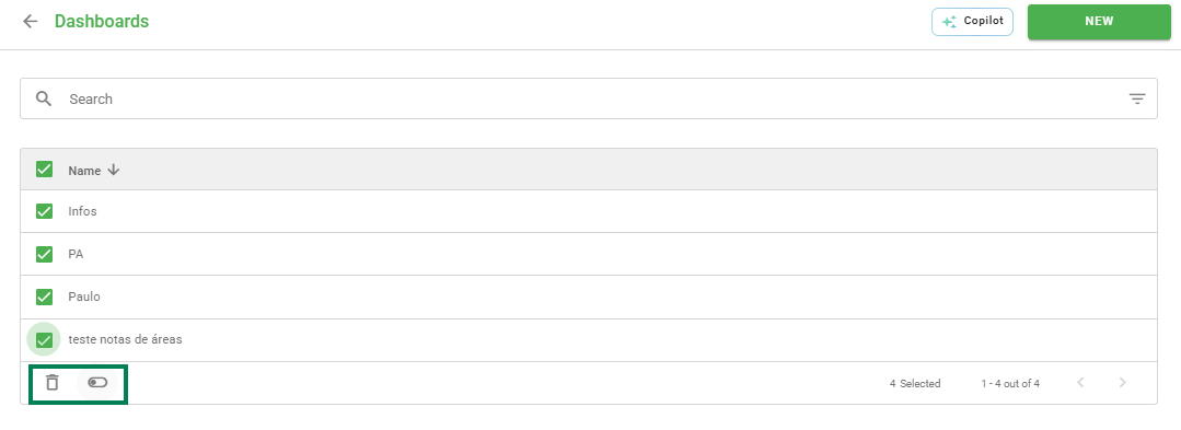 To optimize your time, you can perform changes to several items simultaneously. Select the checkbox next to the "Name" column to mark all Dashboards or select the boxes individually.