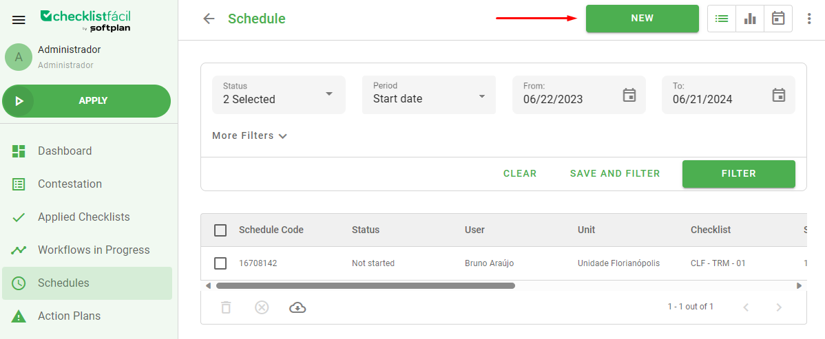 Schedules are intended to program checklist application executions for your users. In the Schedules tab, we have a complete view of the existing programs in the database. By clicking New, you can configure an application in detail.