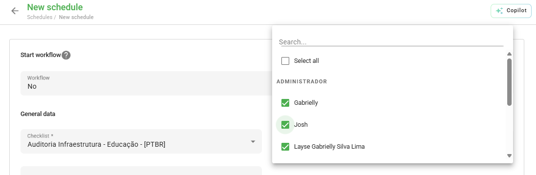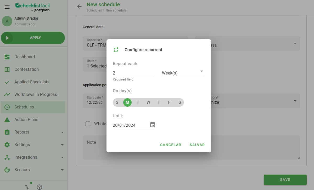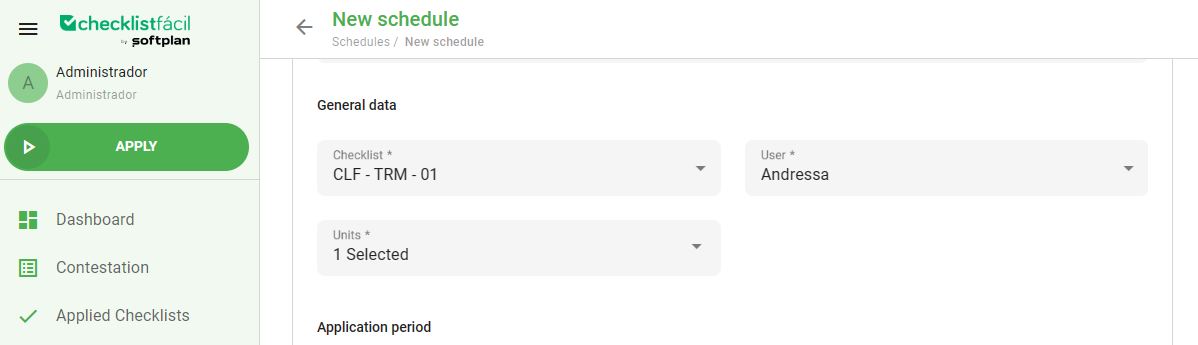 In the new schedule screen, essential information is defined, known as registration data. In it, you select the checklist to be applied, the users who will apply it, and the units that will be evaluated.