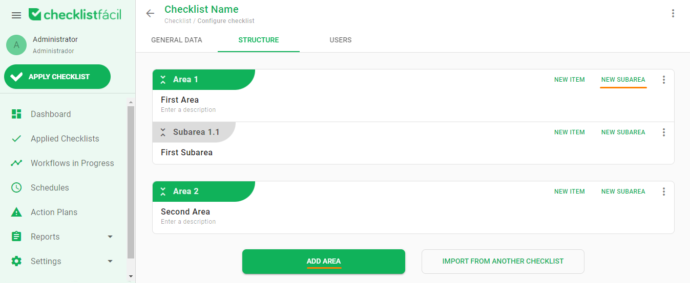 The area has the intention to divide the checklist analysis and application. You can add a new area on add area button, and for an even detailed division, there is the possibility to create a new subarea.