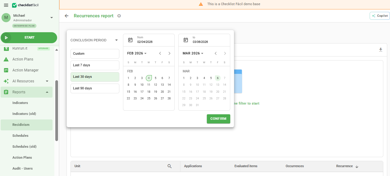 The recurrence screen is fundamental for identifying repetitive problems in your operation. To make this analysis more precise and agile, you have a filter system that allows you to segment data by specific periods or characteristics of your organizational structure.