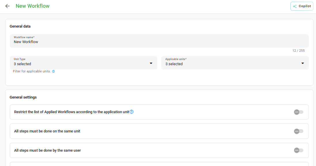 - Restrict list: Displays the workflow only to users linked to the application units.