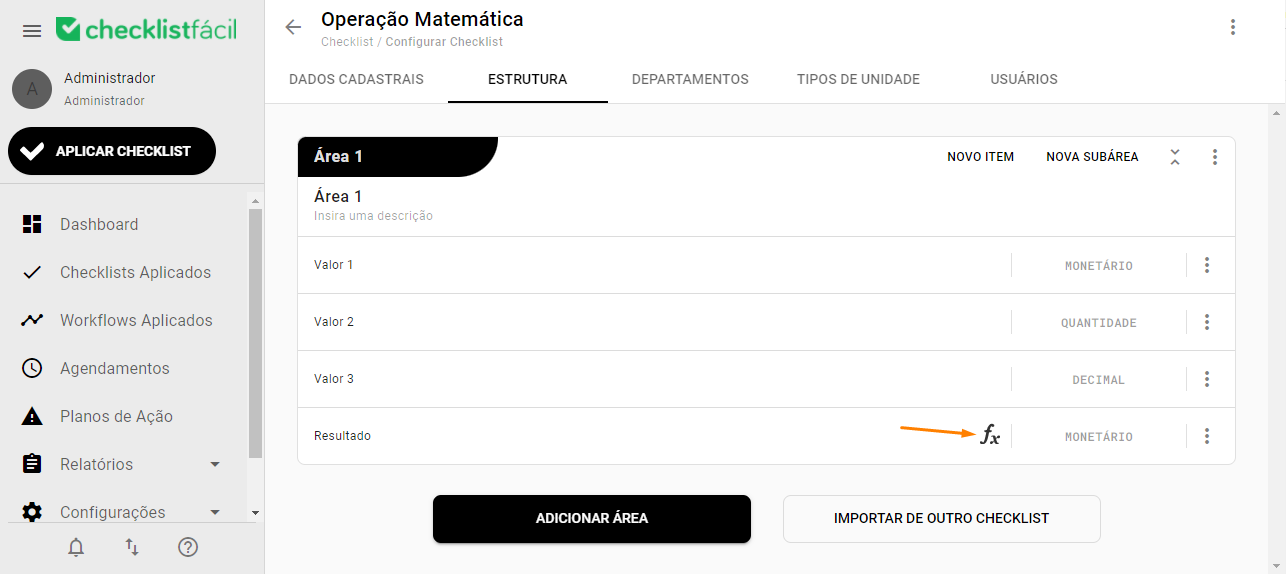 The mathematical operation consists of performing calculations of the results of the numerical items of the checklist. With this functionality you have the option to Add, Decrease, Divide and Multiply items of the numerical scale questionnaires, regardless of the order or area of this item, and it is also possible to use other values independently of the items, thus bringing more automation to your operation.