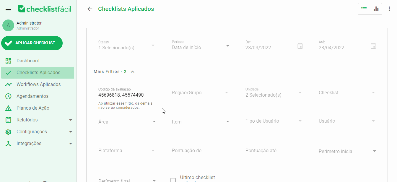 If you know the codes of your Applied Checklists, you can enter them, separated by commas, in Evaluation Code, to present only these results in your query: