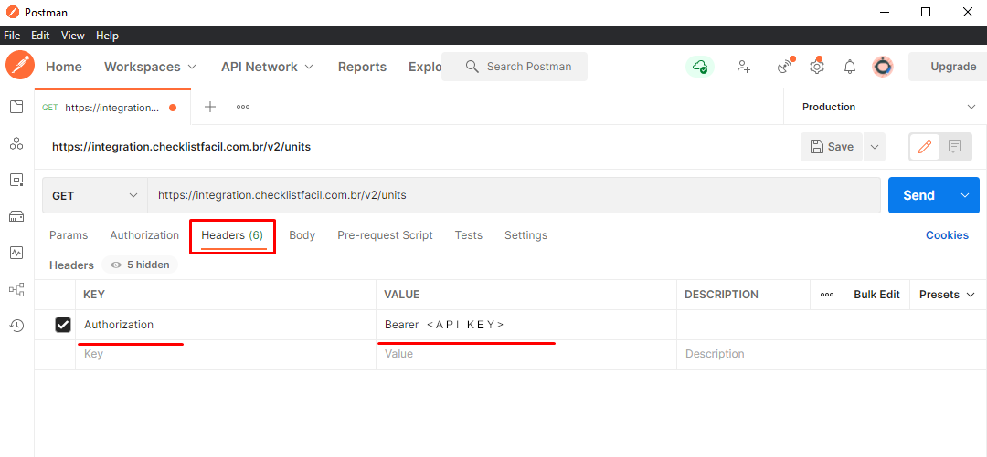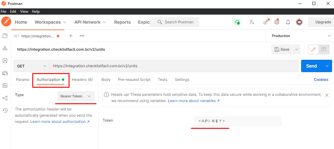 Or you can set up a request to authenticate using the Bearer Token method, the one our APIs use to authenticate. To do that, you must go to the authorization tab and inform your API key.