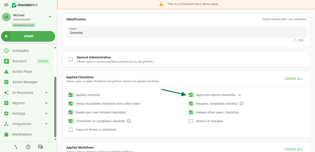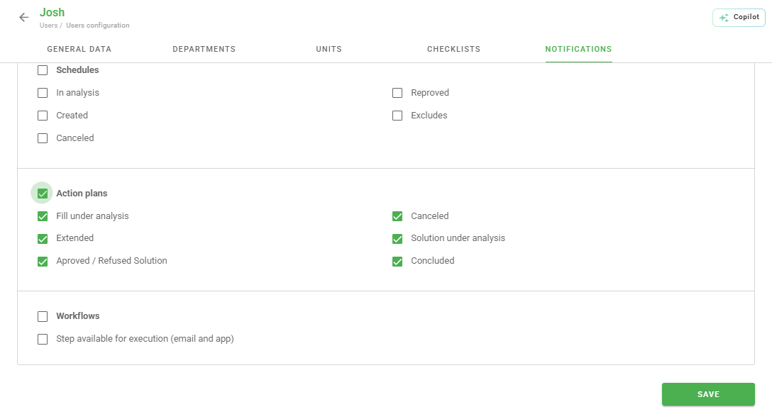 Example: For the user to receive notifications of Checklists pending approval, their user type must have the Approve Checklist permission and the Email option active in the Checklist in question.