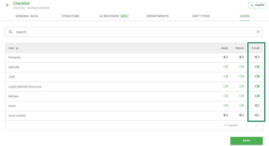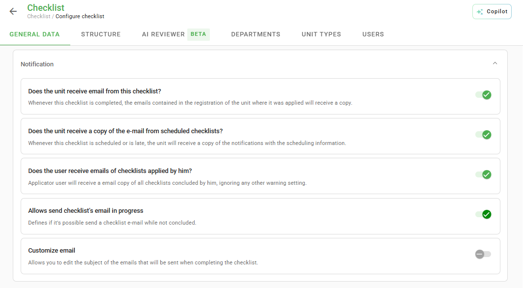 - Does unit receive email of this Checklist?: Triggers a copy of the emails sent to the emails contained in the Email field of the audited unit.