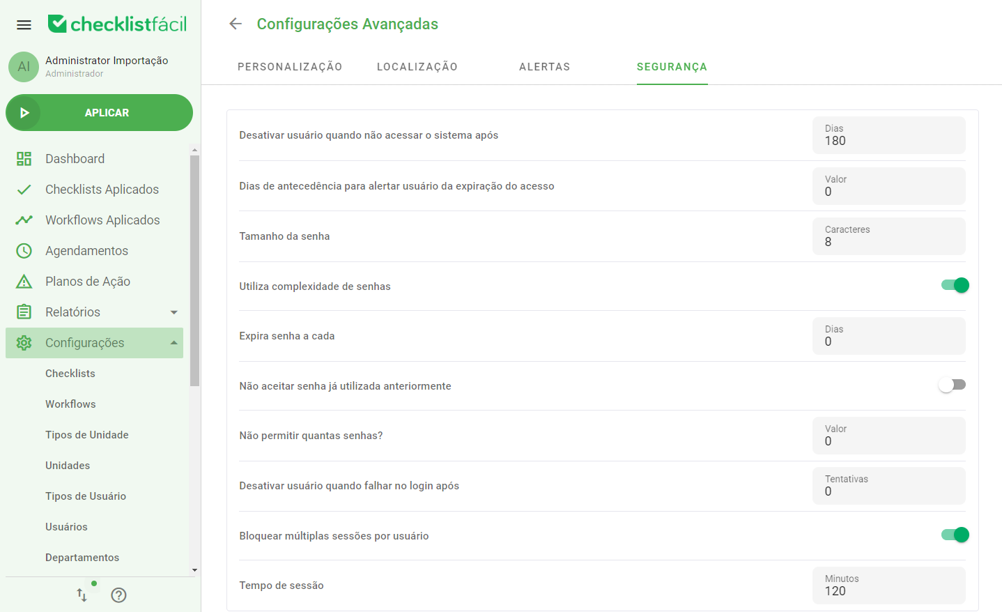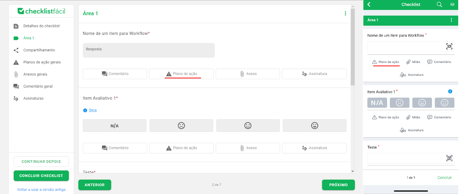 The action plan is intended to report any impediment or problem observed while filling out your answers. It is also possible that filling out the plan is mandatory, depending on the answer completed in a certain item or the configuration defined by managers or administrators of your company in the Checklist Fácíl.