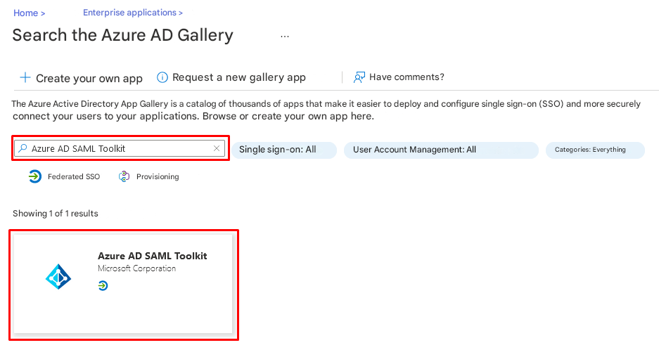 - Select "Azure AD SAML Toolkit" from the results panel and add the application. Wait a few seconds while the application is added to your tenant.