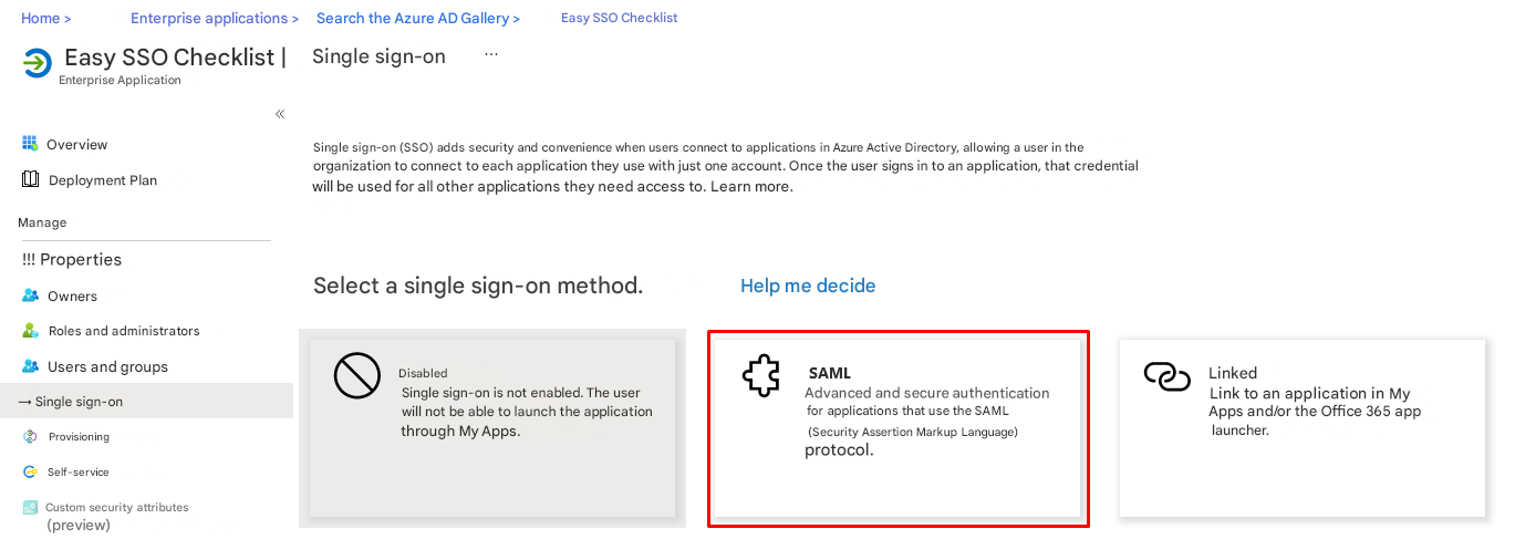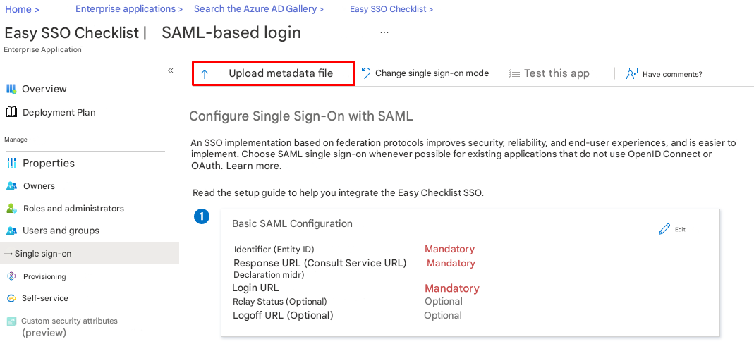 - Log in to the Azure portal, navigate to the "Checklist Fácil SSO" application page (Azure AD SAML Toolkit, added in the previous step), locate the Manage section in the sidebar, and select single sign-on.