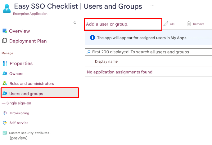 The user can assign individual users or groups to the application by accessing the "Checklist Fácil SSO" application > "Users and groups" > "Add user".