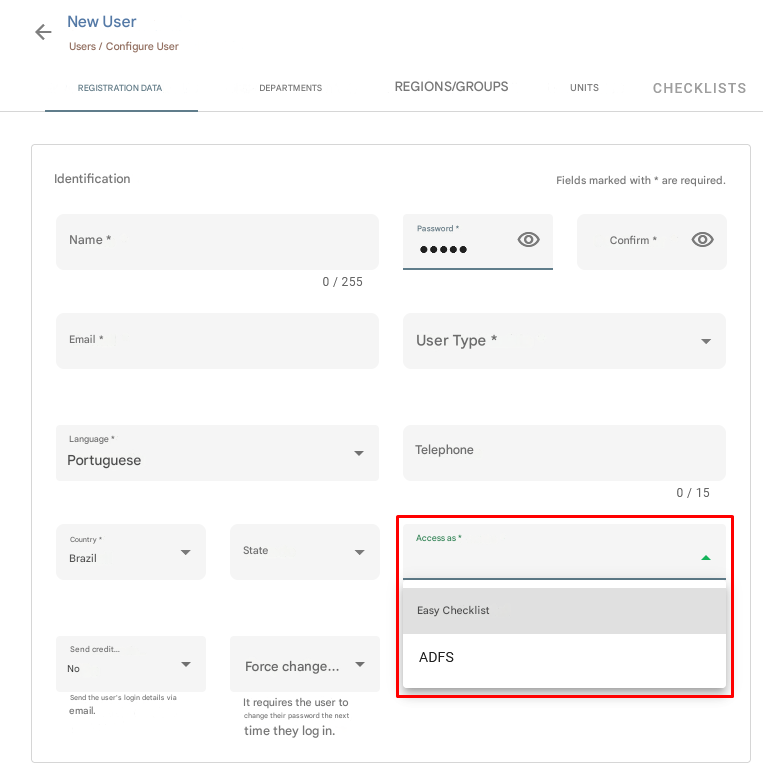 → Remember: When registering or editing a user in Checklist Fácil, you need to define the type of login they will use to access the system.