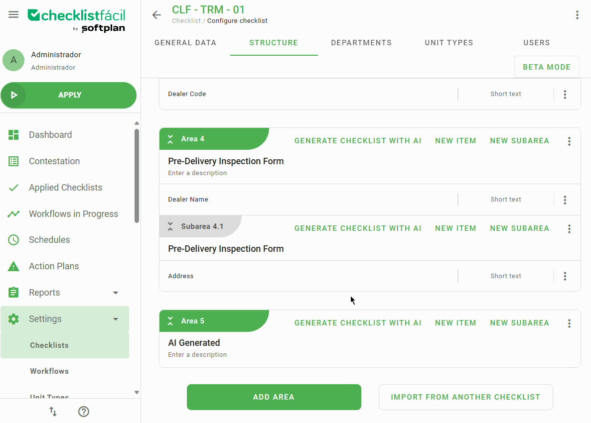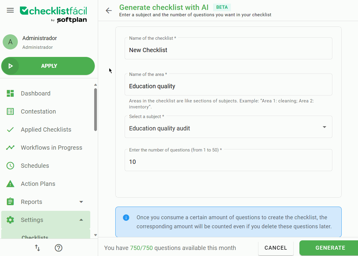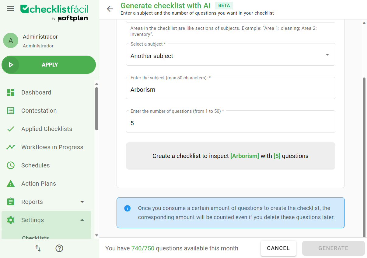 After this, just set up the name of the checklist, name of the area created using AI, the subject and the number of questions you want in your checklist.