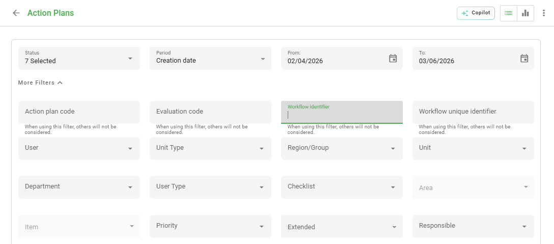 It is now possible to filter Action Plans using the Unique Identifier of a Workflow. This functionality allows you to locate, in a centralized and fast way, all plans that are linked to a specific workflow.