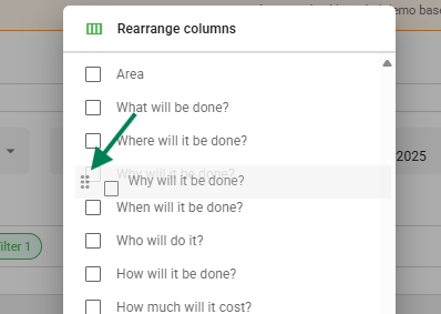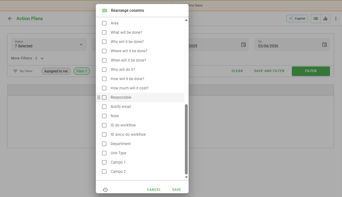We are publishing an update for the visualization of Action Plans information. It is now possible to configure the custom fields of the additional module Customize Action Plan in the Reorganize columns option, directly on the Action Plans screen.