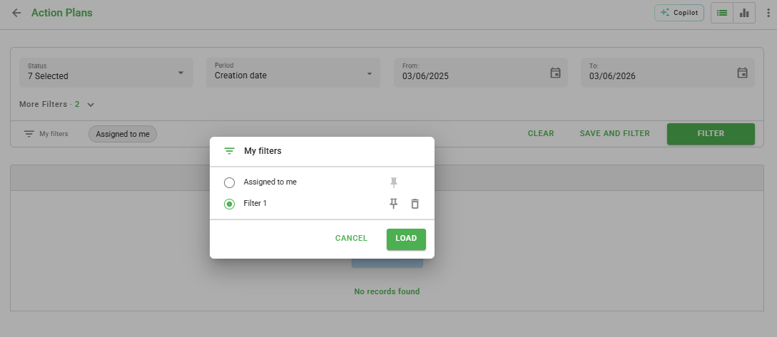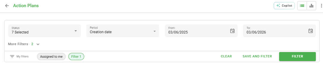 This filter displays pending action plans (except canceled and concluded) created in the last year, linked to your user, your user type, or departments you are part of.
