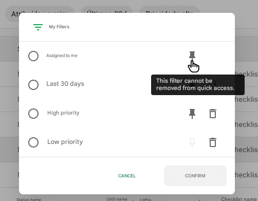 By default, the assigned to me filter will already be pre-pinned in your quick access. It is important to note that this specific filter cannot be removed from the shortcut bar.