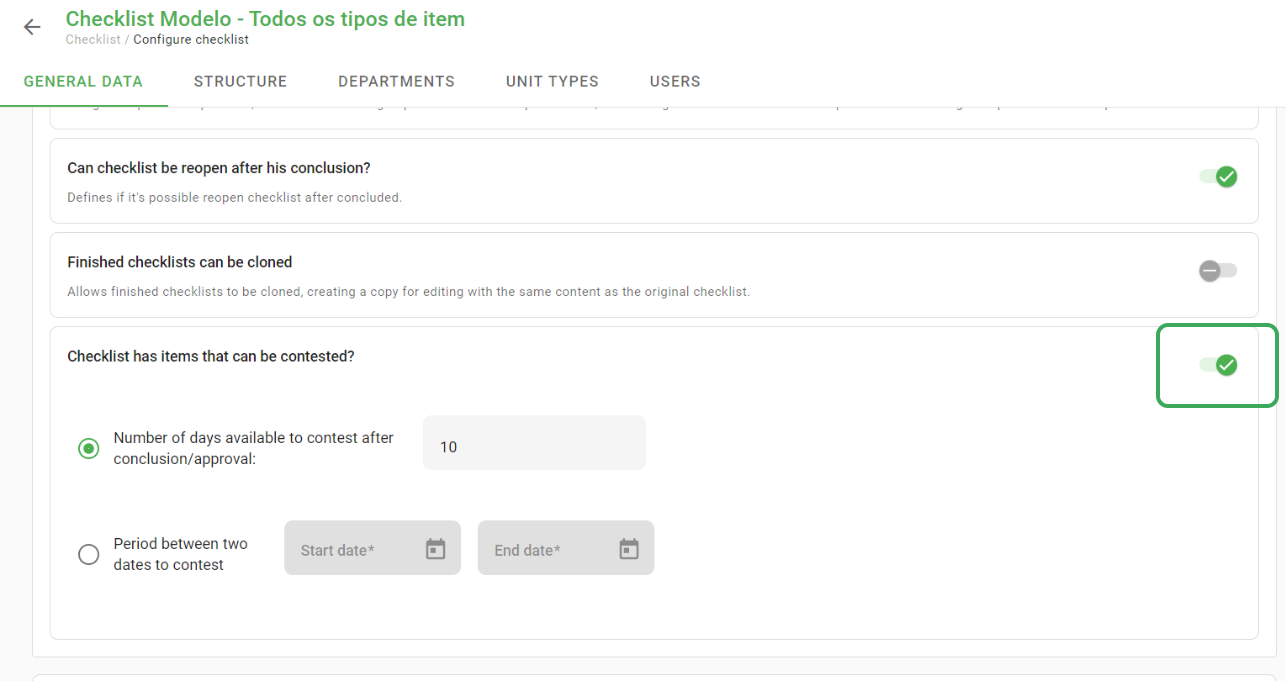 The contestation period must also be defined here. This can be a number of days after completing the checklist or a custom period.
