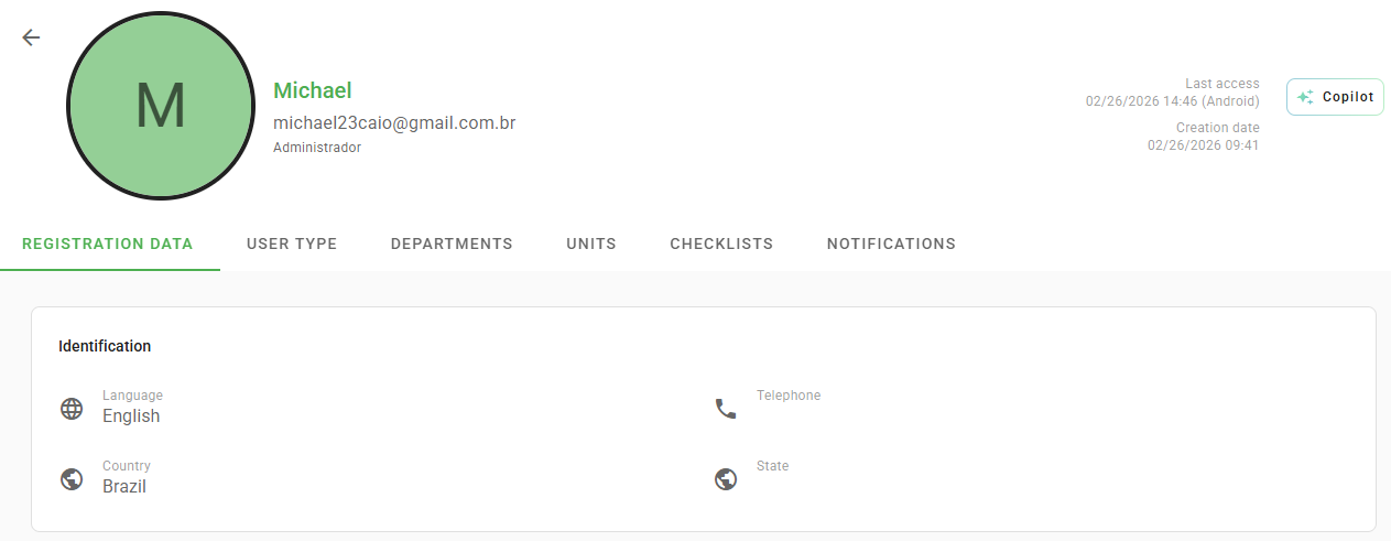 - My profile: by accessing your profile, you can insert a photo and verify information such as Registration Data, User Type, Departments, Units, Checklists, and Notifications to which you are linked.