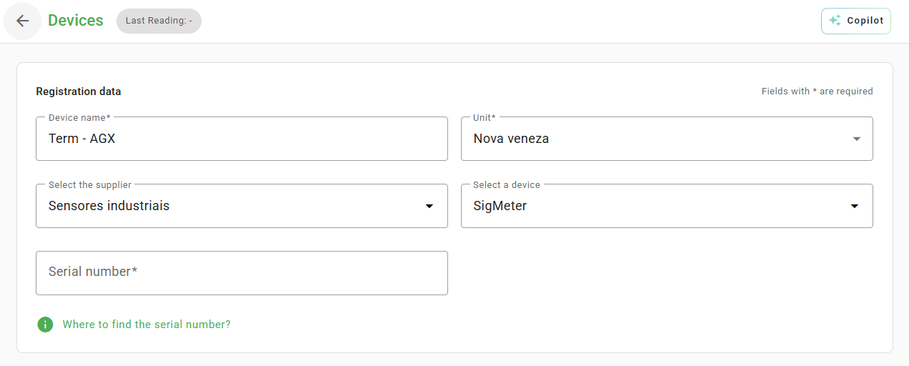 After selecting the supplier, you can enter other information, such as: Device and Serial number.