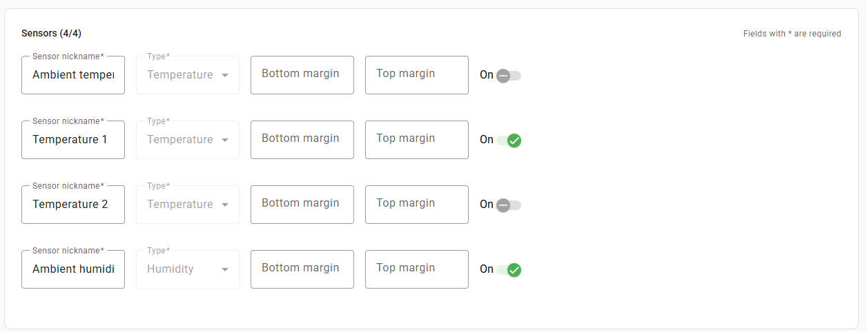Below there will be the available sensors for the device being configured. You can add a nickname for the sensors present and define Lower and upper margins for data collection.